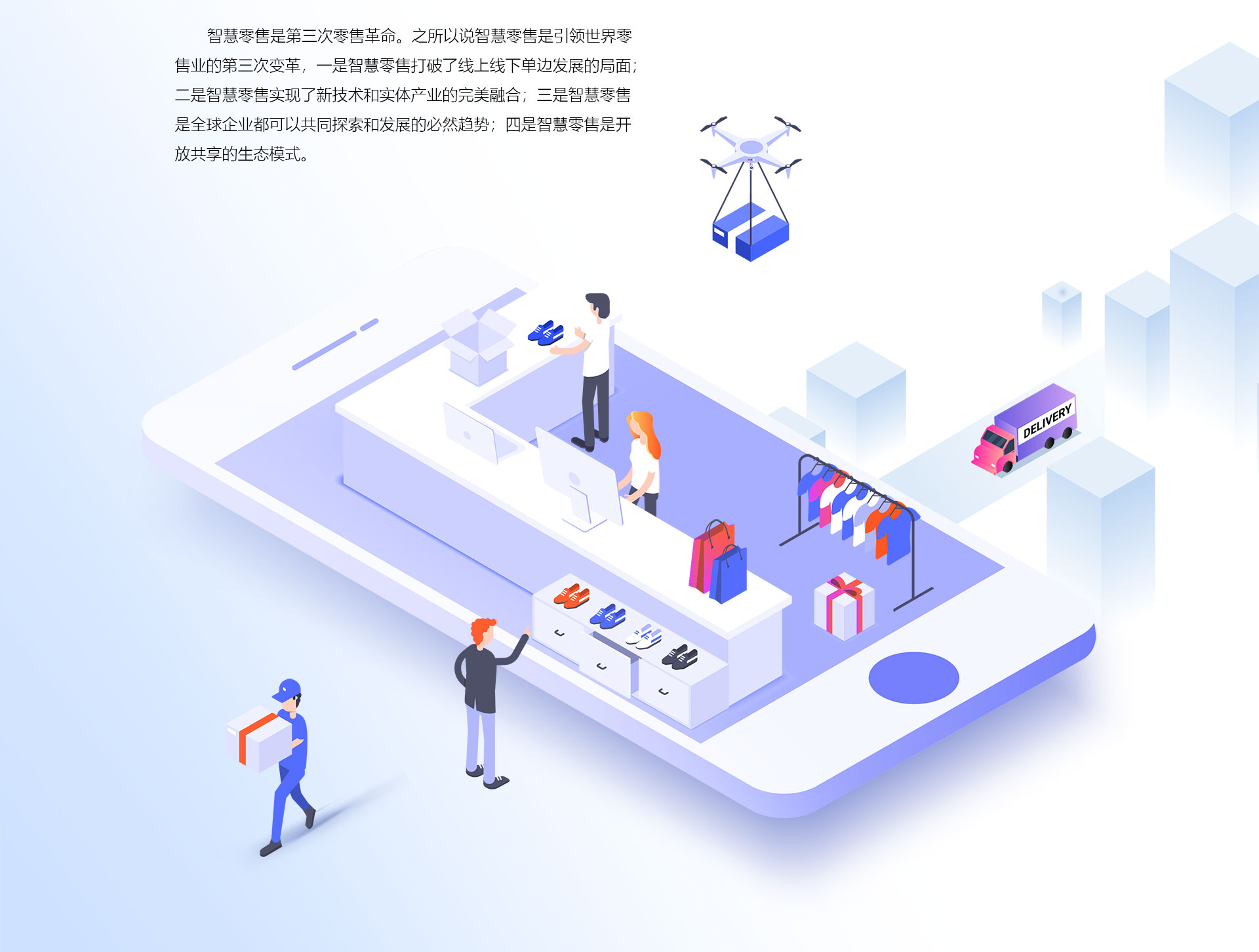 智慧零售,是指运用互联网、物联网技术,感知消费习惯,预测消费趋 势,引导生产制造,为消费者提供多样化、
